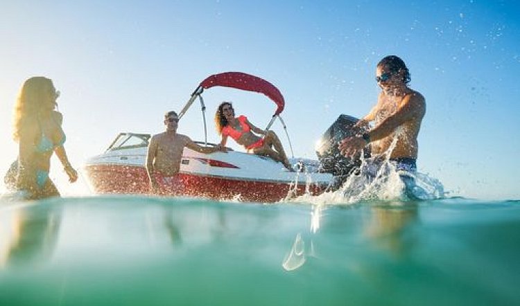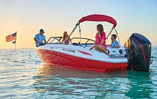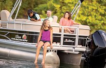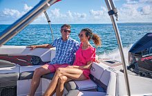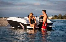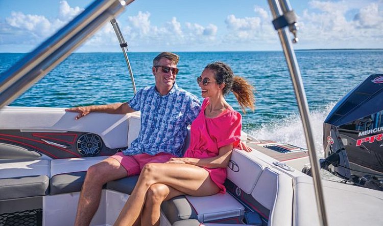 Load up the underseat and STOW MORE™ compartments throughout with more gear. Load up the four couches with more family and friends. Rev up the Mercury motor (up to 250 horsepower!) for more speed and more cruising. When you’re at your favorite cove, extend the QUICKLIFT® Bimini and set up the table for more picnics. And don’t forget to take advantage of the full-width swim platform for more swimming fun.