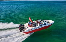 It comes standard with a powerful Mercury® 150HP outboard motor—which works in perfect tandem with the POWERGLIDE® hull design to provide exciting performance for cruising and watersports. In addition, it has bow lounges, a full-width midship lounge and dual bucket seats. Storage below the lounges, in the deck and under the sundeck, among other places, is spacious enough for everyone’s gear (and it’s all finished for easy cleanup)