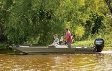 The 1648 SC features a big front deck, wide beam, 2 pedestal seat bases and a roomy interior with a new lockable bow deck storage compartment to make this boat as convenient as it is rugged. It's finished with our industry-exclusive Forest Green powder-coat finish for extreme durability, and backed by with the TRACKER Promise—the best factory warranty in aluminum boats.